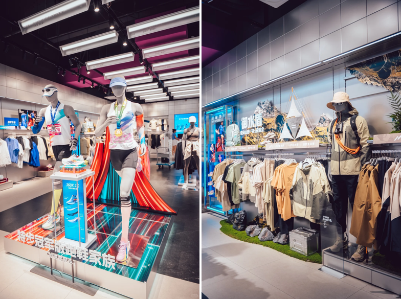 场景化营造,功能与体验联动。门店可见清晰的分主题构建场景,其中跑步区以“冠军跑鞋家族”为核心,模特搭配赛事号码布、奖牌,还原专业运动氛围;户外区植入苔藓、岩石装置,营造浓浓的山野氛围感。