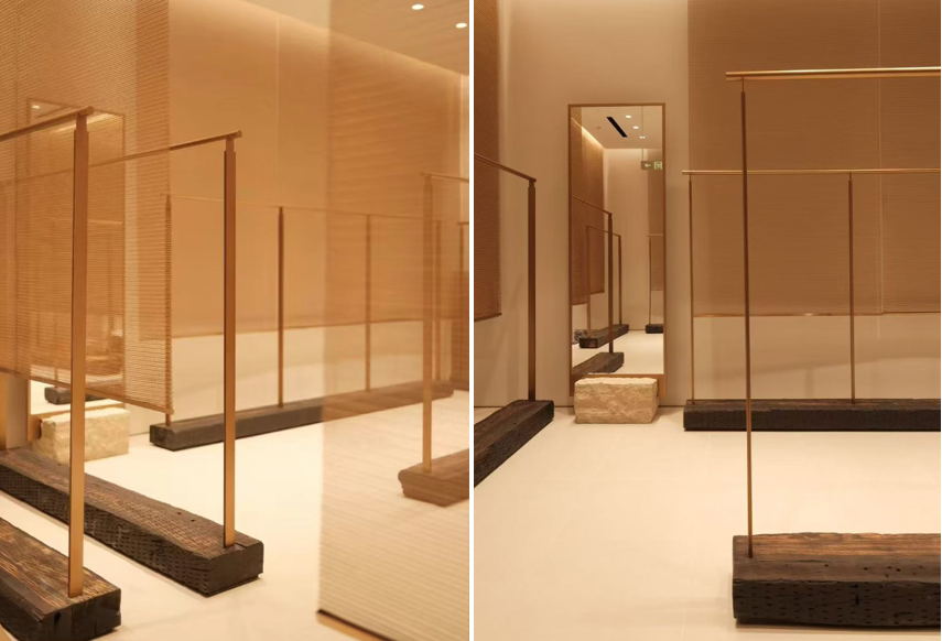 日式秩序美学,凸显差异化质感。产品覆盖T恤、外套、裤装及配饰,兼顾专业户外与日常穿搭。货品按米、灰、浅蓝等低饱和自然色系分类挂放,铜色衣架配旧木底座的展具简约不冗余,既让产品成为视觉核心,呼应品牌“功能内敛”的质感表达。