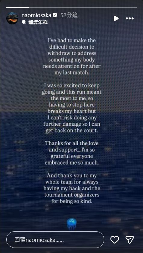 “上一场比赛后,我的身体出现了一些问题,我不得不做出艰难的决定,退出比赛。”
