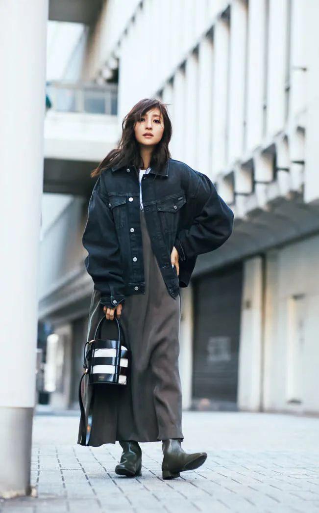 当季的理想穿搭是将黑白配色穿出轻盈感。用连衣裙制造整体修长的轮廓,搭配有垂坠感的黑色牛仔夹克,增添柔美气息。